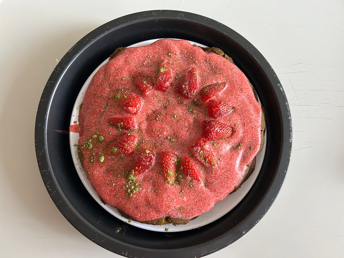 A quick Google search brought me to Rhian’s Recipes’ Gluten-Free, Vegan Matcha Strawberry Cake.